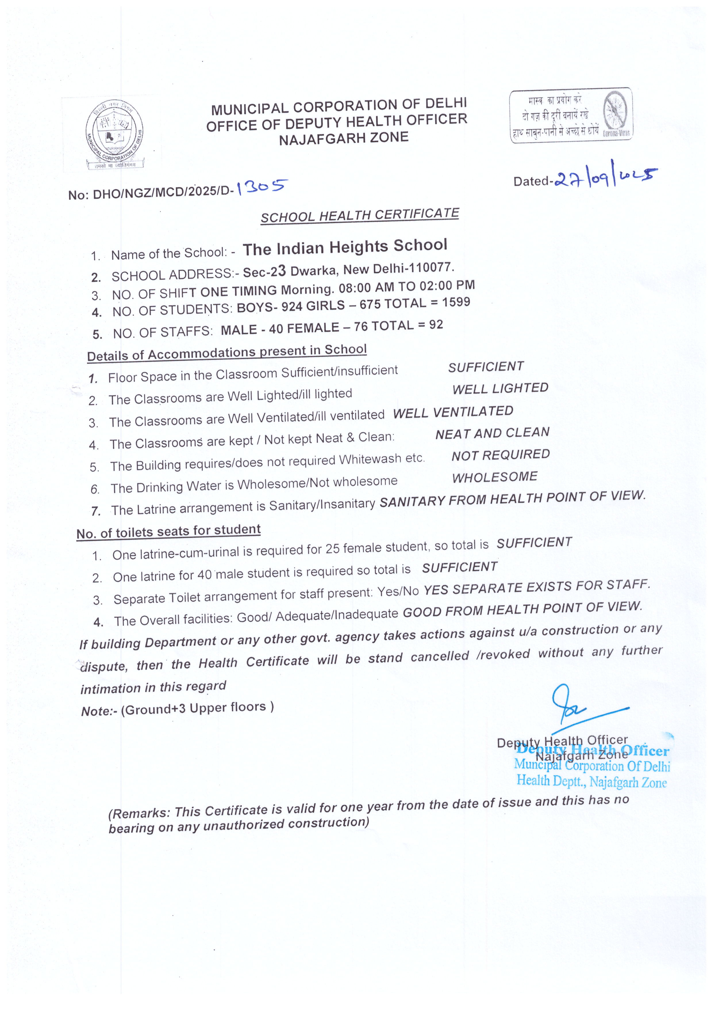 The Indian Heights School, Dwarka, New Delhi is affiliated with CBSE, vide Affiliation No. 2730616, valid upto 2031.
